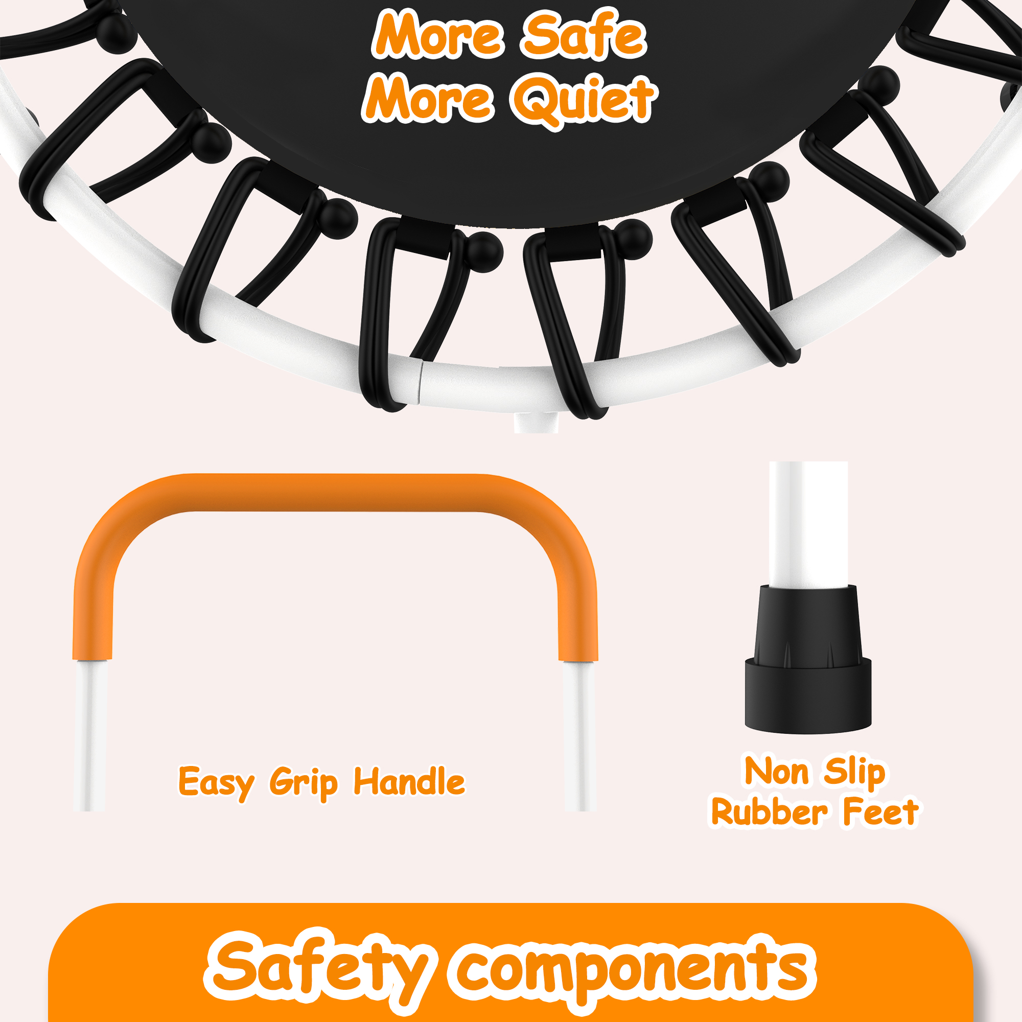 • Springfree -We adopt bungee cord to create the cute baby trampoline which is safer and quieter than other trampolines with spring. The bungee cord is more elastic than other materials, providing toddlers with a better bouncing experience